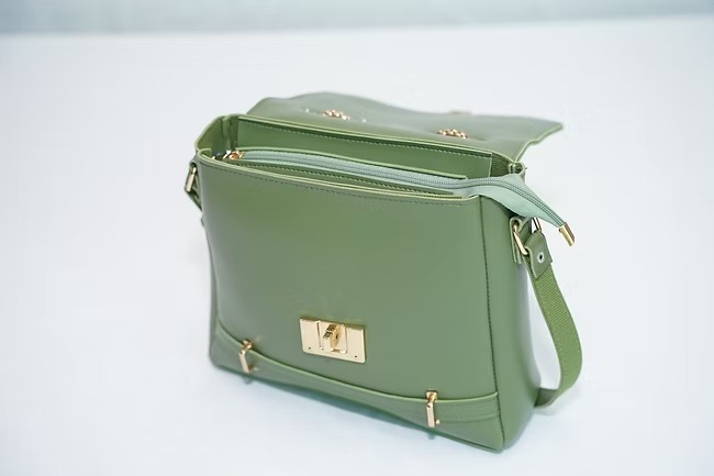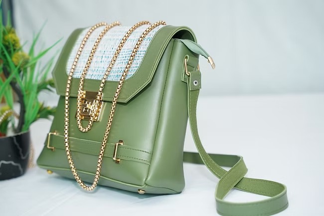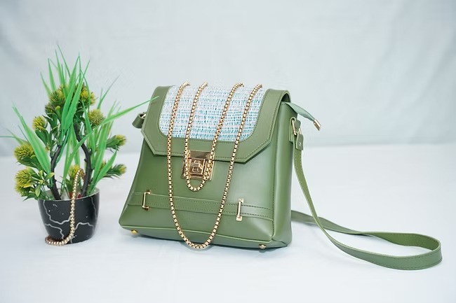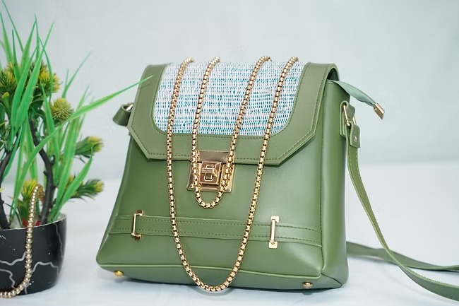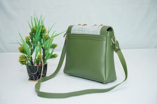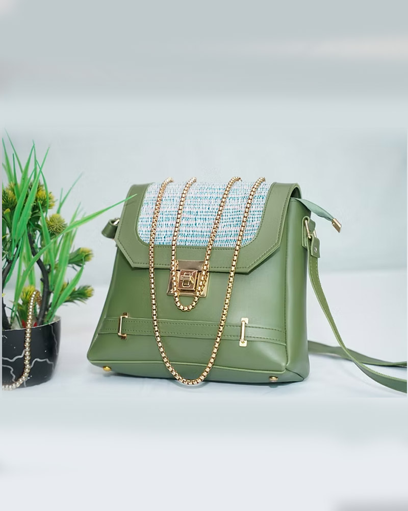 This PISTACHIO green bag is made from leatherette and khaadi threads. It is totally hand made. Some gold details are added to the bag to enhance the elegence and beauty of it.